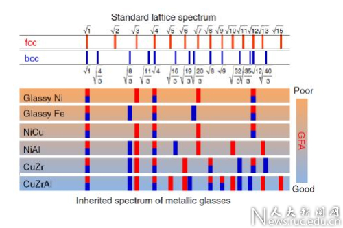 红线和蓝线分别代表标准谱中fcc和bcc晶格结构中原子间距离的特征值。对于金属玻璃而言,部分对关联函数的特征峰遗传了标准谱里的特征值。可以看出,金属玻璃的隐含拓扑序是通过从标准晶体结构谱里遗传一个或者多个特征值序列而形成的。通常随着化学成分的增多,更多的隐含拓扑序在玻璃形成过程中经过遗传而形成。遗传越多的隐含序意味着该金属合金体系的玻璃形成能力越强。(注:GFA: glass-forming ability)