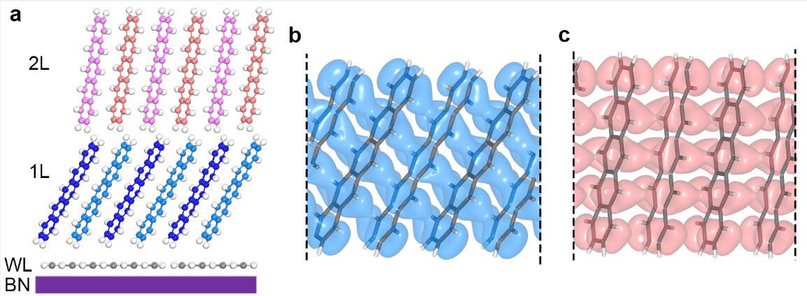 图a:并五苯结构侧视图;图b:第2层分子间成键态波函数实空间分布;图c:第3层分子间成键态波函数实空间分布。