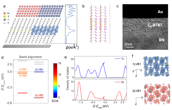 图a:1L C8-BTBT和金电极接触构型示意图。图b:2L C8-BTBT构型。图c:1L C8-BTBT薄膜晶体多电极器件高分辨透射电子显微镜图像。图d:1L, 2L C8-BTBT与金电极的能级分布。图e:1L, 2L C8-BTBT电子态密度。图f:1L, 2L C8-BTBT最高占据态波函数。